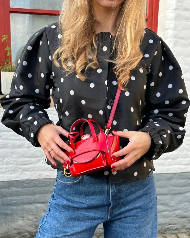 De pofblouse van Stine Goya is een echte blikvanger en de statement piece van de dots trend van 2026. Het Deense label staat bekend om zijn creatieve prints en uitgesproken silhouetten, en deze zwarte blouse met bolletjesprint is daar een perfect voorbeeld van. Ideaal om een verder sobere outfit kracht te geven en de trend meteen in de spotlight te zetten.