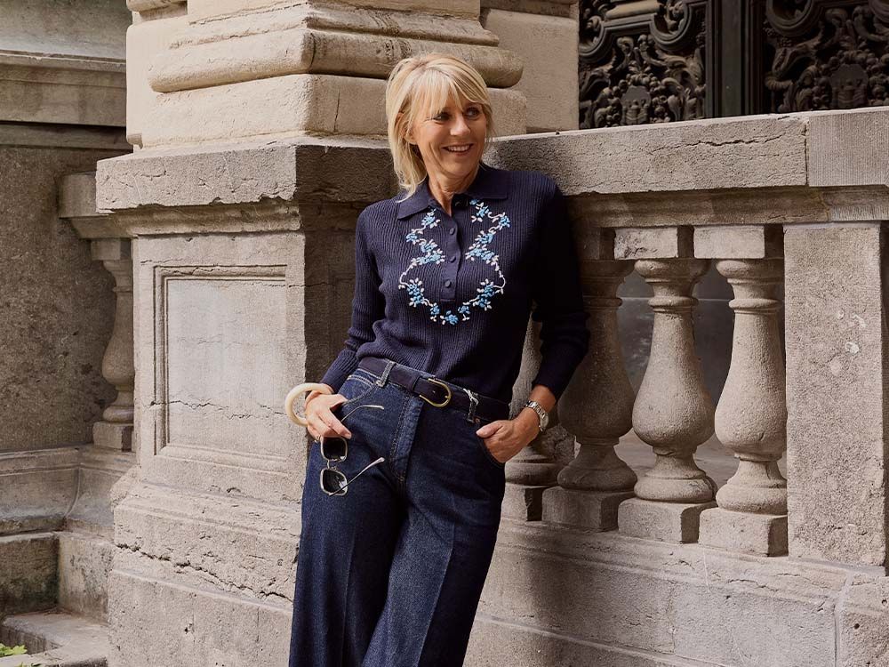 Voor haar eerste look kiest ze voor een trendy polo en een losvallende blouse van Baum und Pferdgarten, gecombineerd met een comfortabele jeansfit van Haikure en tijdloze loafers van Sebago. Haar tweede outfit straalt laid-back luxe uit met een deux-pièce van K&J, perfect voor een dagje in de stad of een wandeling langs de dijk. Ze maakt de look af met sporty sneakers van Hoff en een elegante handtas van Vanessa Bruno.
